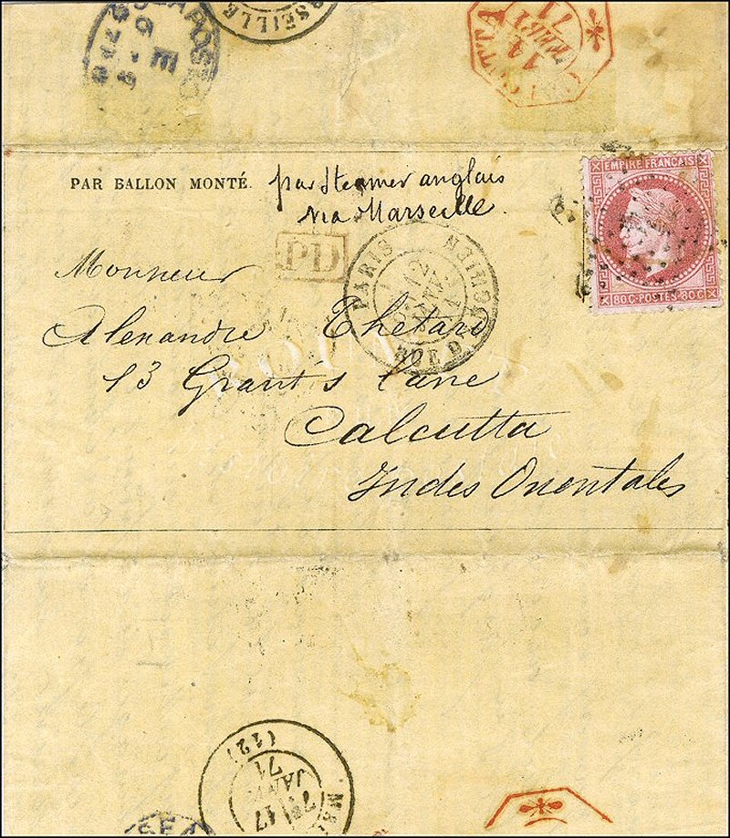 Une destination hors du commun pour cette Gazette des Absents n°26 ayant voyagée par le ballon "Le général Faidherbe", puis expédiée vers Calcutta (Indes Orientales). Oblitéré d'un cachet à date Paris rue d'Enghien le 12 janvier 1871, affranchi au tarif à 80 centimes pour cette destination lointaine, ce ballon monté comporte au verso d'un cachet de passage à Marseille le 17 janvier 1871, et du cachet d'arrivée CALCUTTA 14 FEBY 1871. Très rare.